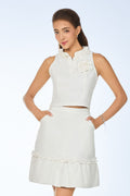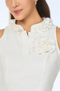Top: Sleeveless, butterfly button at collar, optional flower embellishment (fixed or removable pin)
