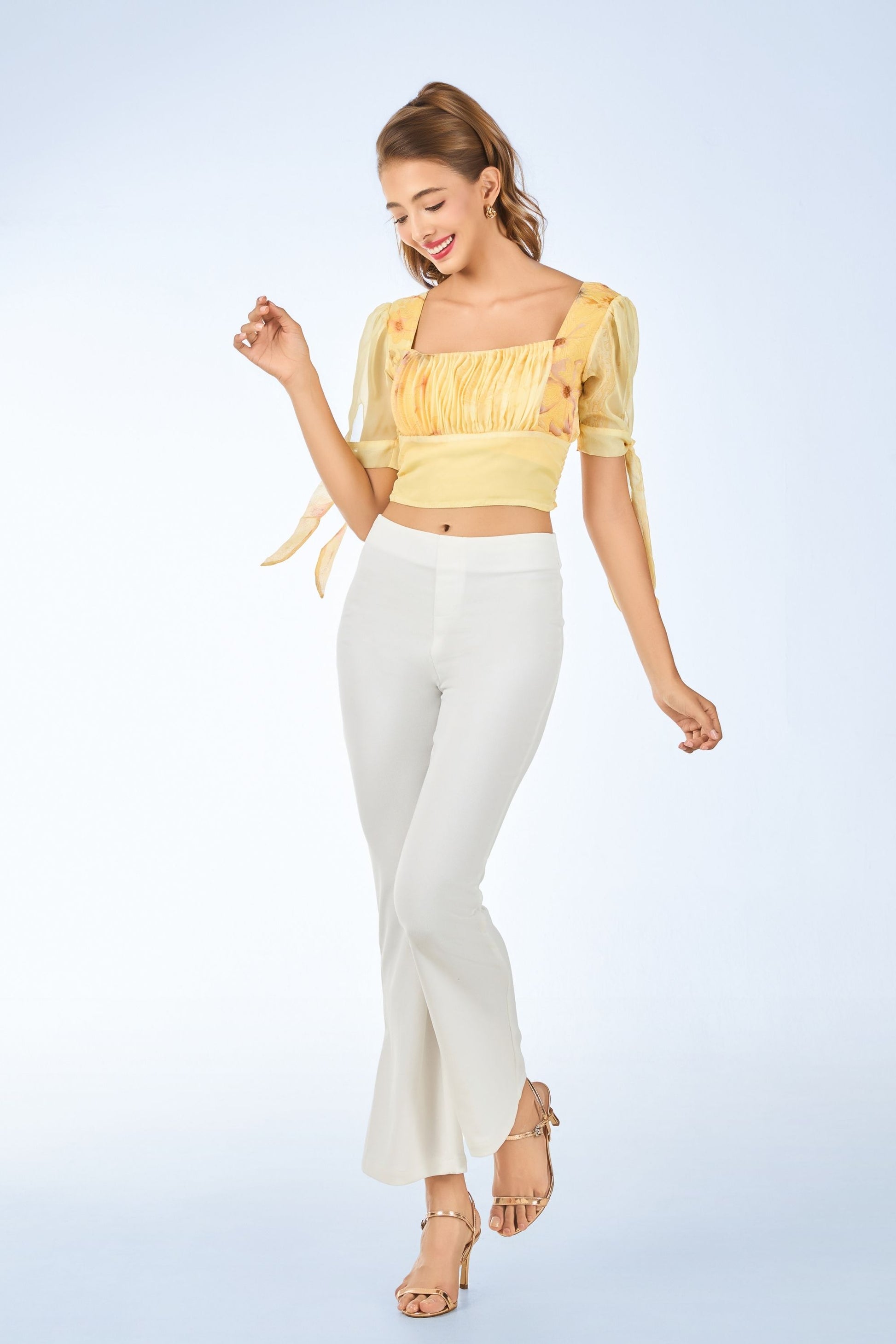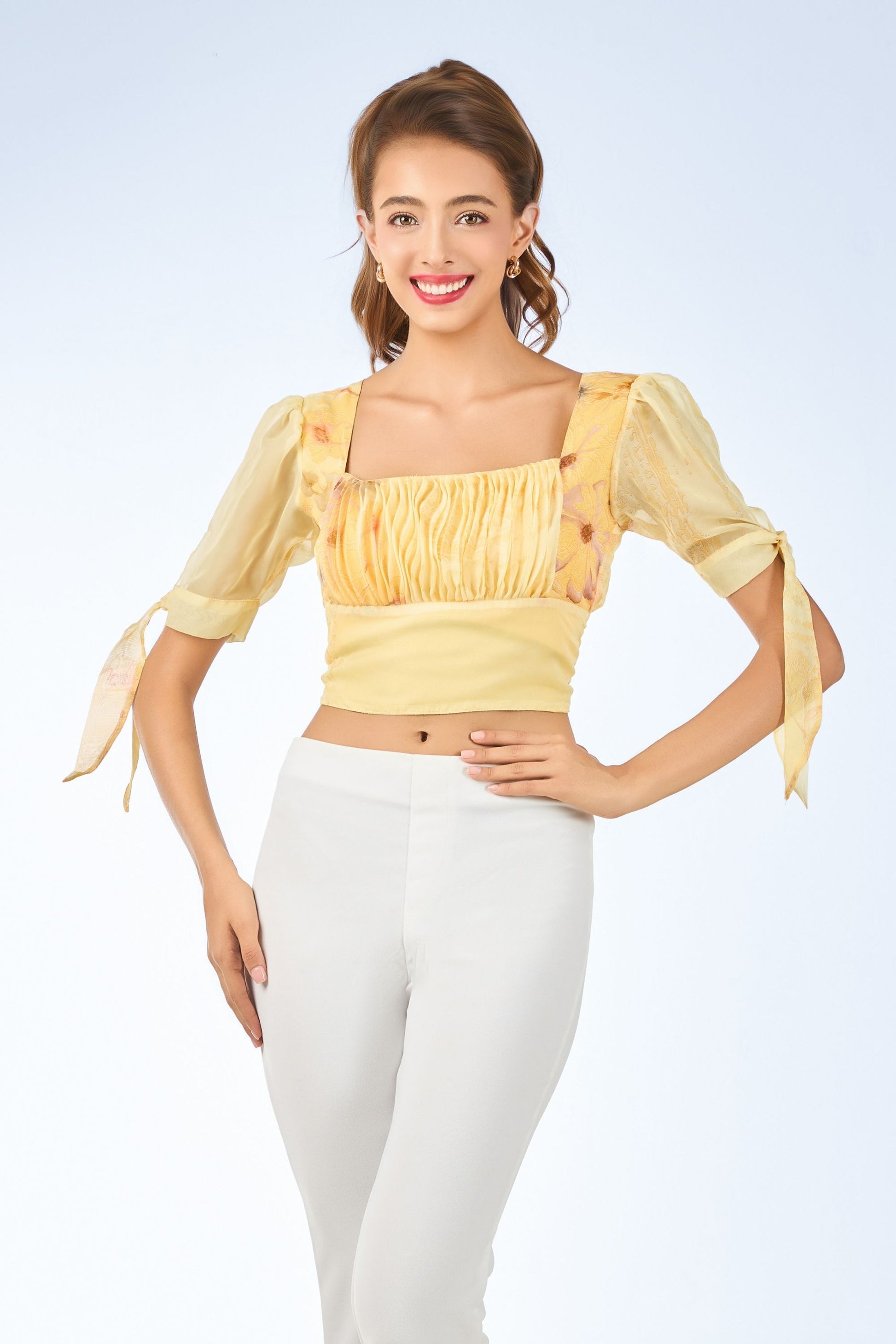 I designed this top to be like a soft breath of sunlight pleats for volume, ties for rhythm, elastic for freedom. Yellow Bloom is my favorite: Vanda's exclusive print designed just for you, rare and radiant.