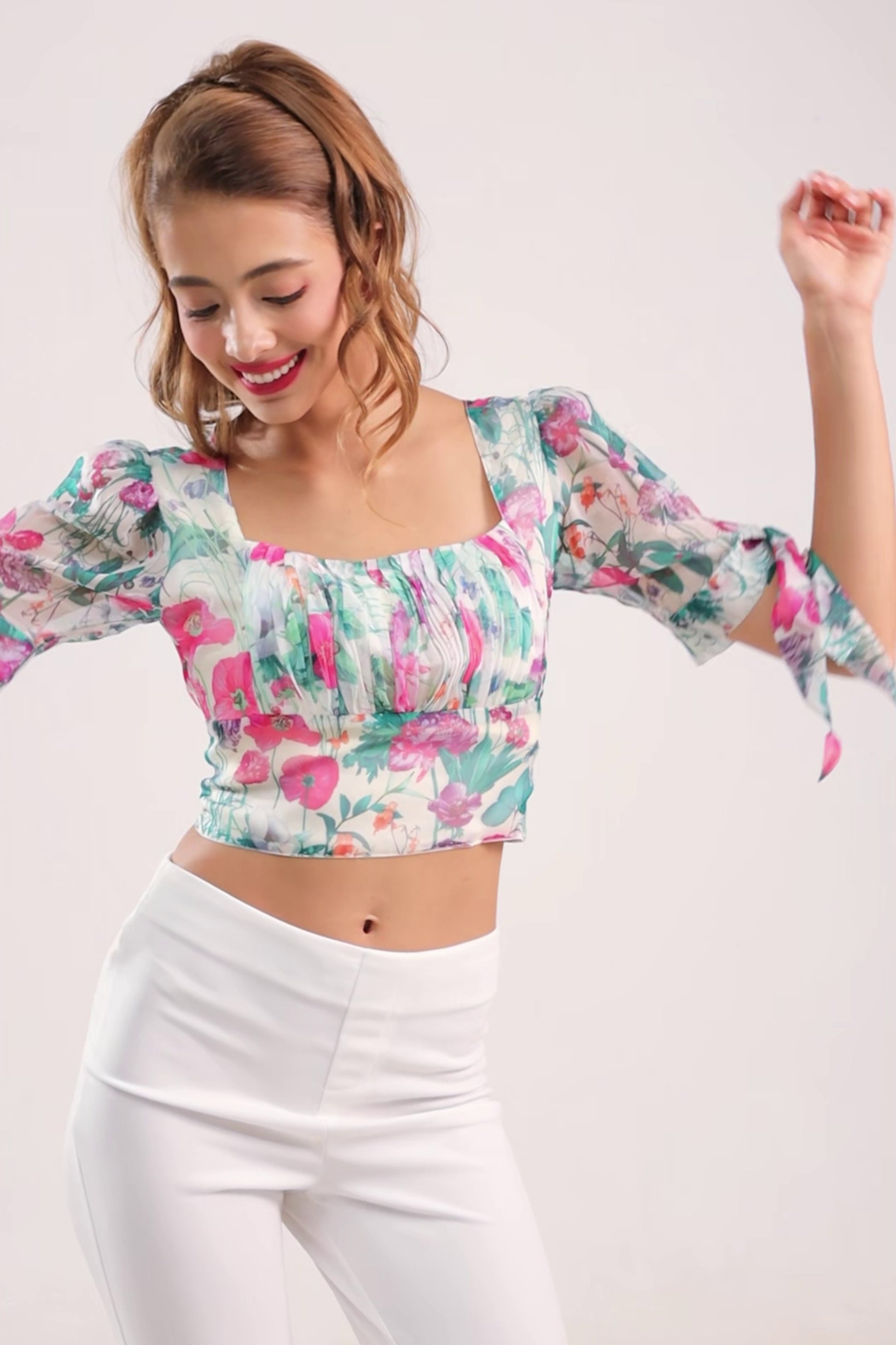 The Aurora Pleated Chiffon Crop Top features pleated detailing at the bust, which adds gentle volume and femininity. Its body is lined with Vanda’s signature silky lining for comfort. The back elastic smocking ensures a comfortable fit while sheer sleeves float unlined, tied at the cuffs for elegance and movement. A hidden zip makes it effortless to put on.