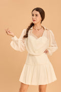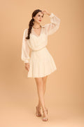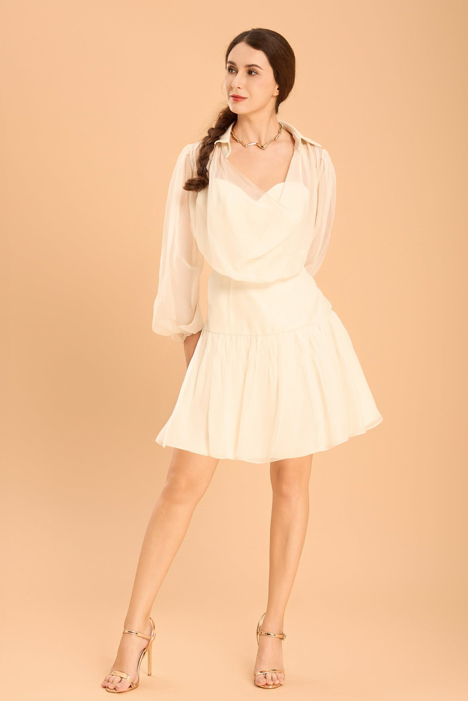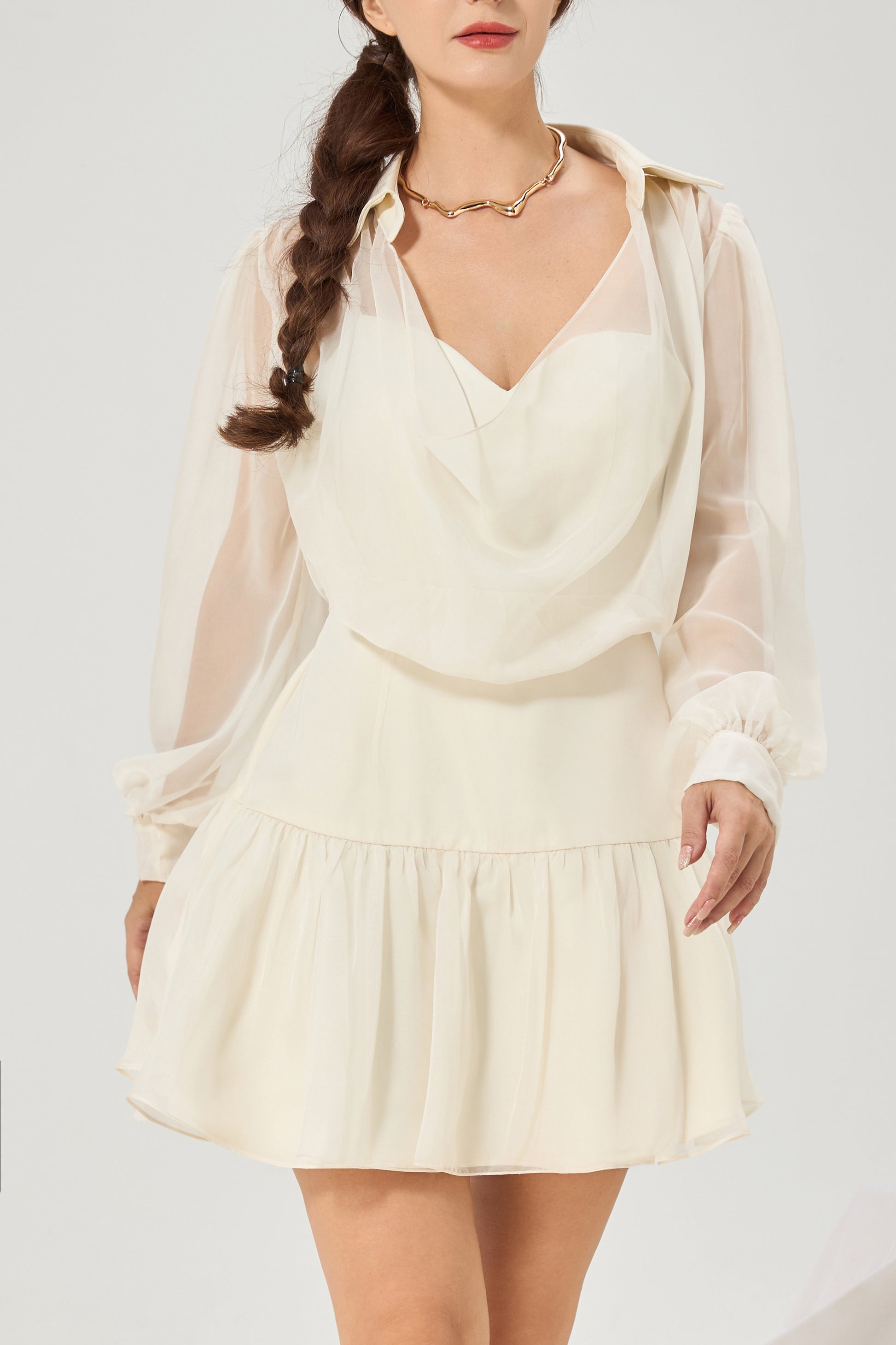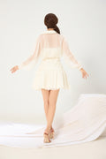 As airy as a whisper, as confident as a statement. The Camellia Chiffon Shirt Dress floats like chiffon but lands with intention. With its draped neckline, sheer billowy sleeves, and softly flared mini hem, it’s tailored for women who lead with grace - and don’t need volume to make a presence.