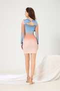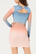 Celeste Ombre Mesh Bodycon Dress is designed to hug and highlight - with a soft ombre mesh that shifts from sunrise peach to dusky blue, and a flexible design that lets you wear the twist-back detail in the front or back. One side is sleek with a clean round neckline, the other more daring with a keyhole bow finish.