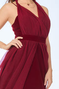 The long chiffon back panel can be tied up around the neck for elegant coverage, or left to cascade freely for graceful movement.