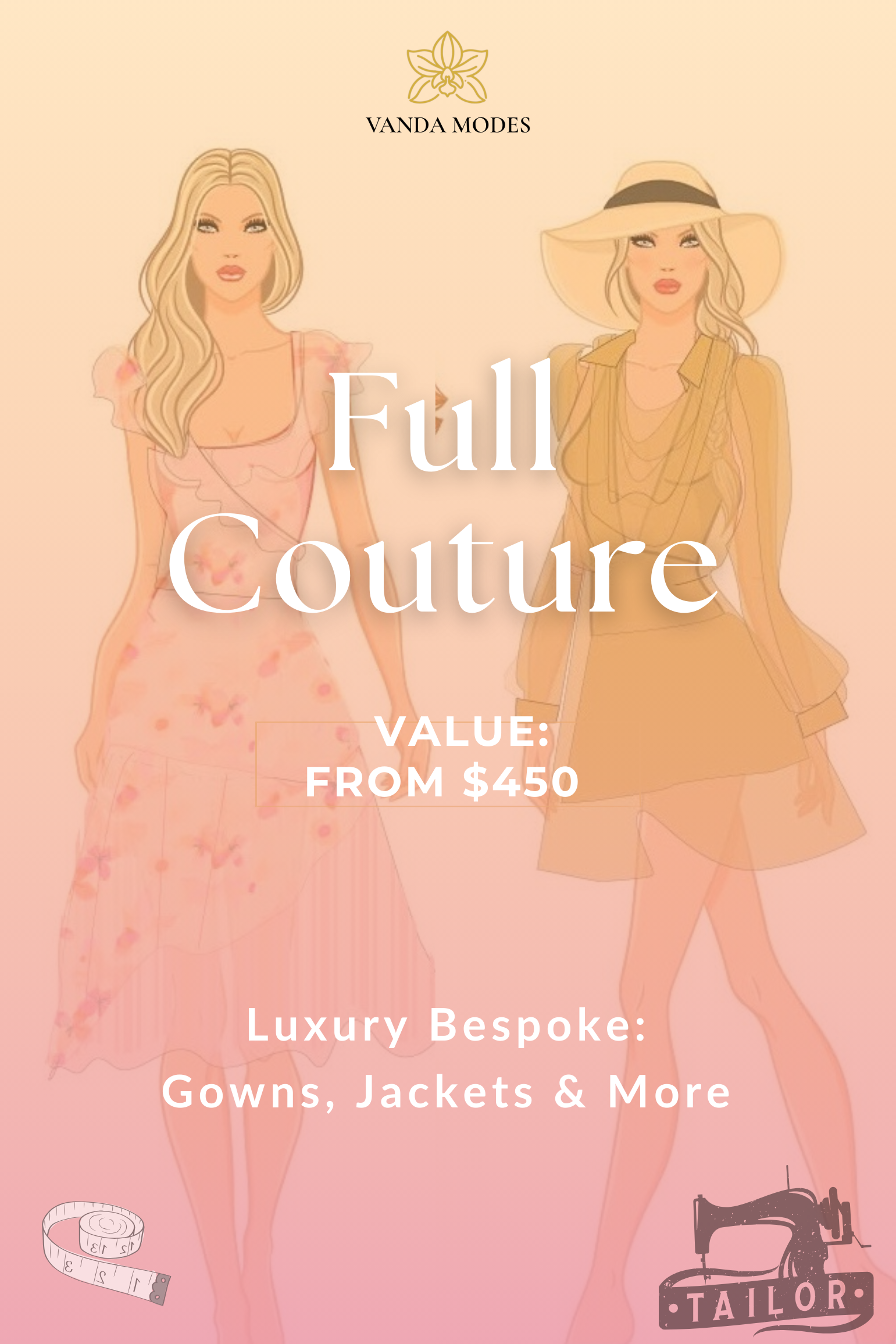 - Full design process with sketches, fabric sourcing, and fittings (digital or in-person).