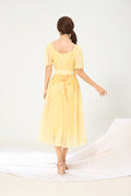 A dress that moves like sunlight and settles like grace. This Marigold Pleated Chiffon Midi Dress was made for golden moments - when you need comfort, elegance, and quiet confidence in one perfect piece.