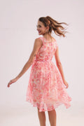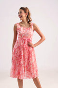 With its soft pleated chiffon skirt and floral print, this dress brings lightness to every step. A self-tie belt lets you cinch it gently at the waist, while the floaty short sleeves and round neckline offer coverage with charm.