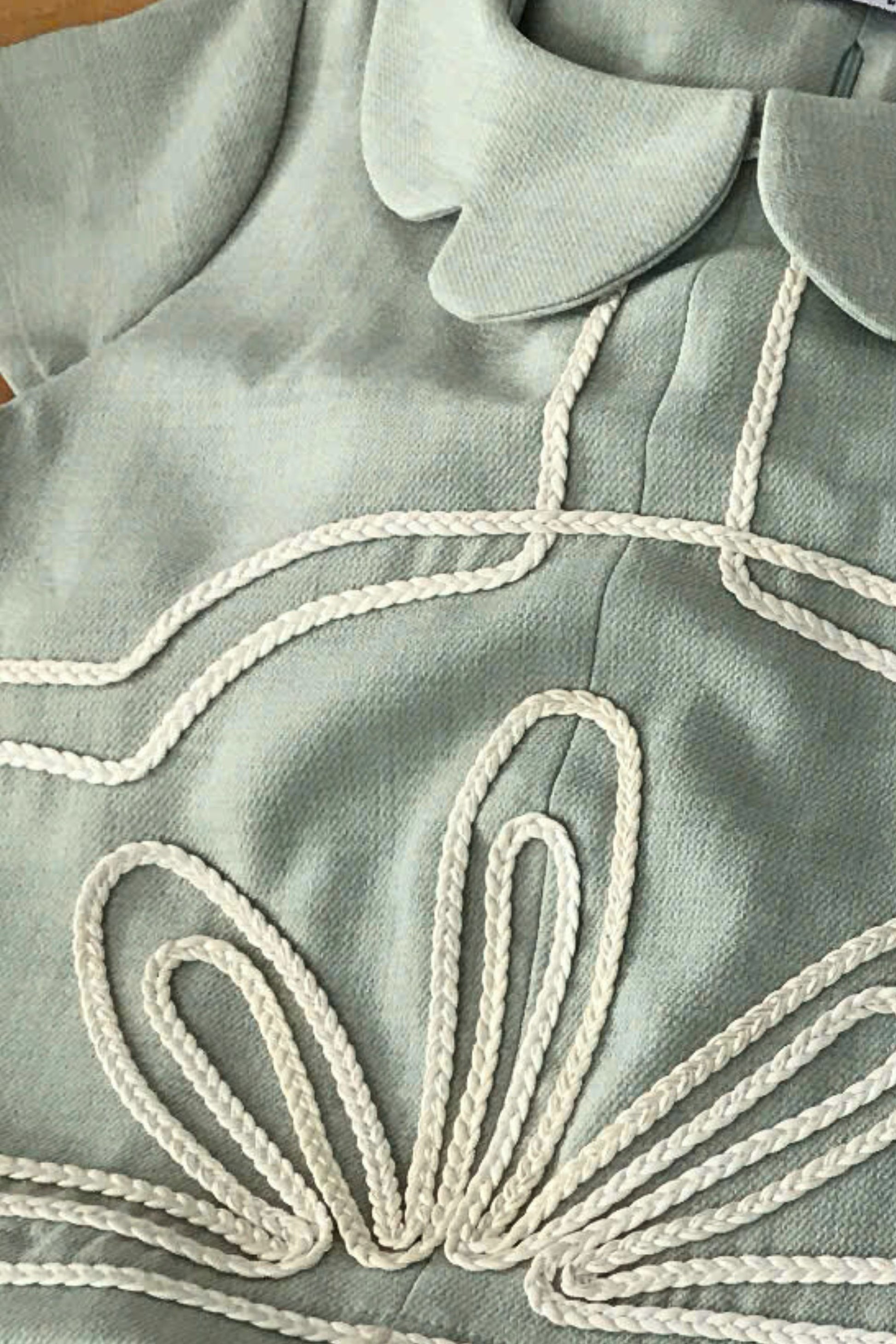 Top: Petal neckline + sleeves, hand-braided appliqué detail on front