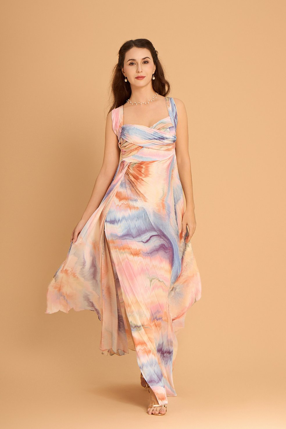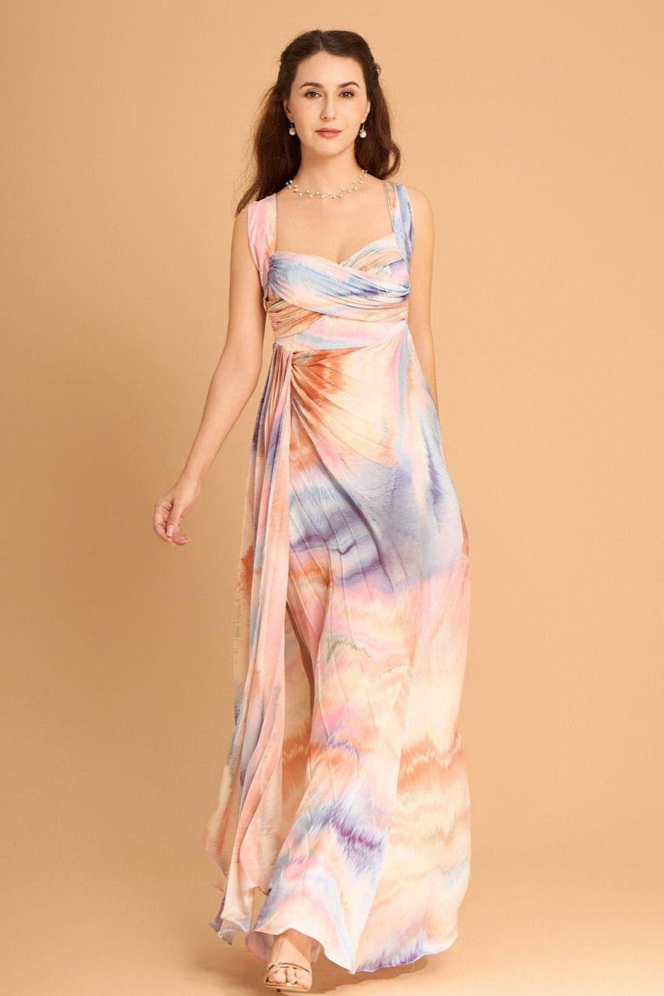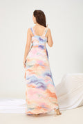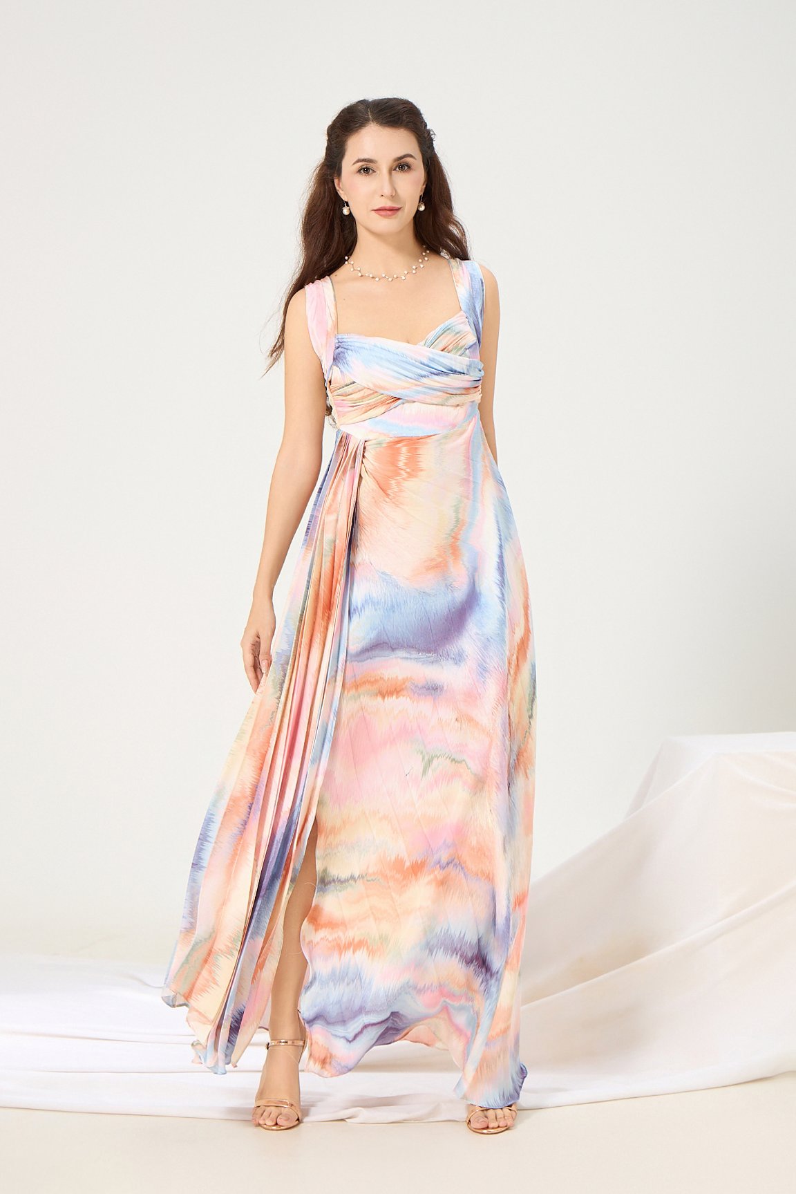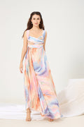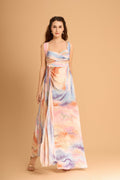 The Sirena Watercolor Gown is a moment - sweeping, luminous, and impossibly soft. Crafted in silky fabric that ripples with every step, its dreamy watercolor print evokes ocean skies and coastal sunsets. The sweetheart neckline and draped bodice sculpt the silhouette, while the floor-grazing skirt floats around you like a warm breeze.