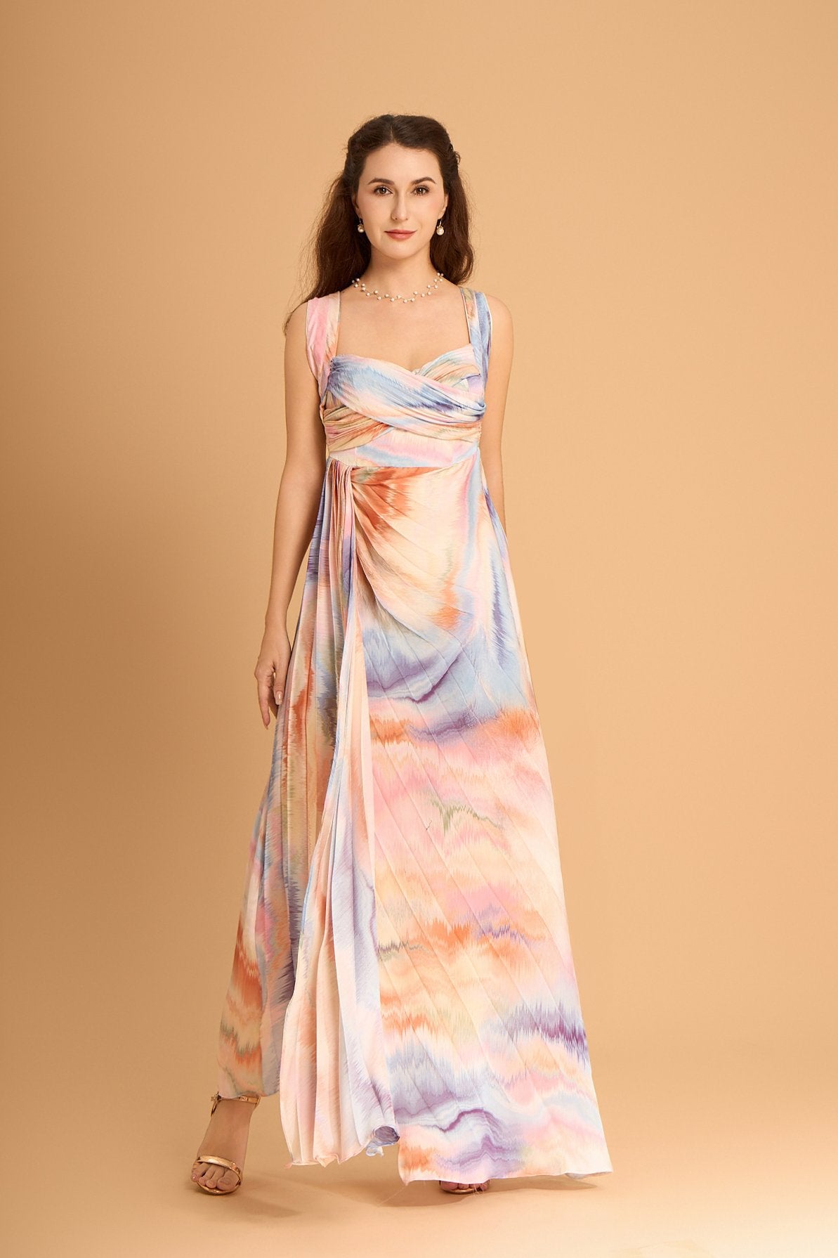 Fabric: Lightweight, breathable silky polyester with painterly watercolor print and pleated techniques for added luxurious touch.