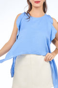 - Top: Sleeveless, round neckline, French seams, draped side panels